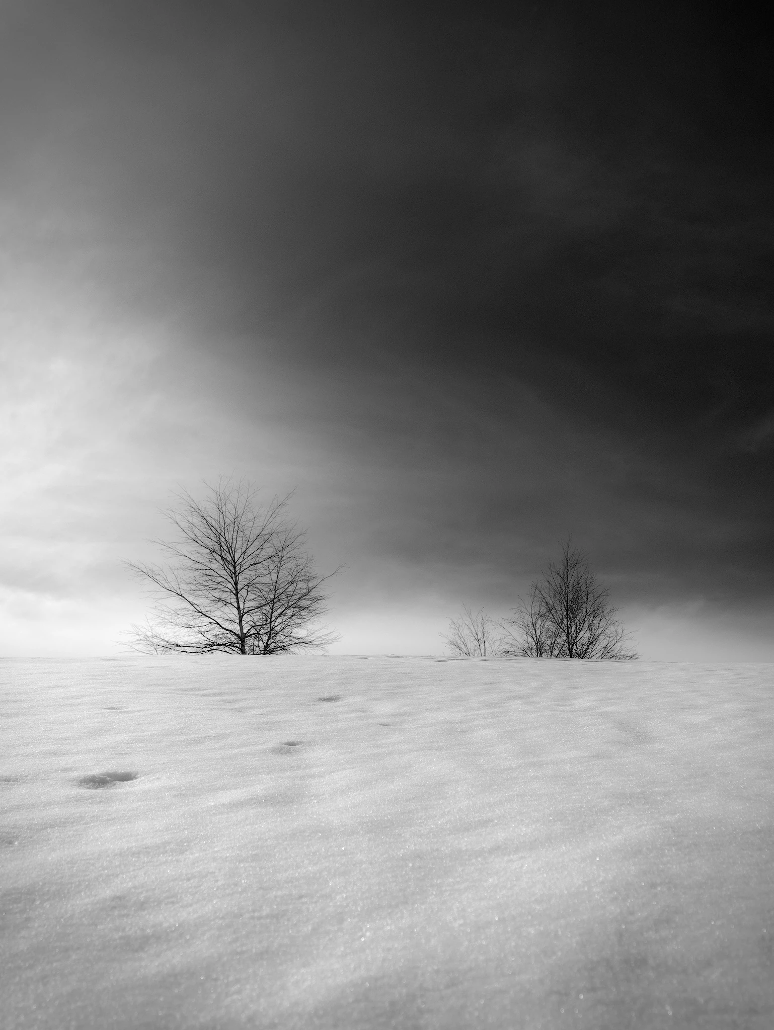 Where the snowfield meets a heavy sky, a few isolated trees mark the edge of the forest. Nothing extra. Just structure, stripped bare.